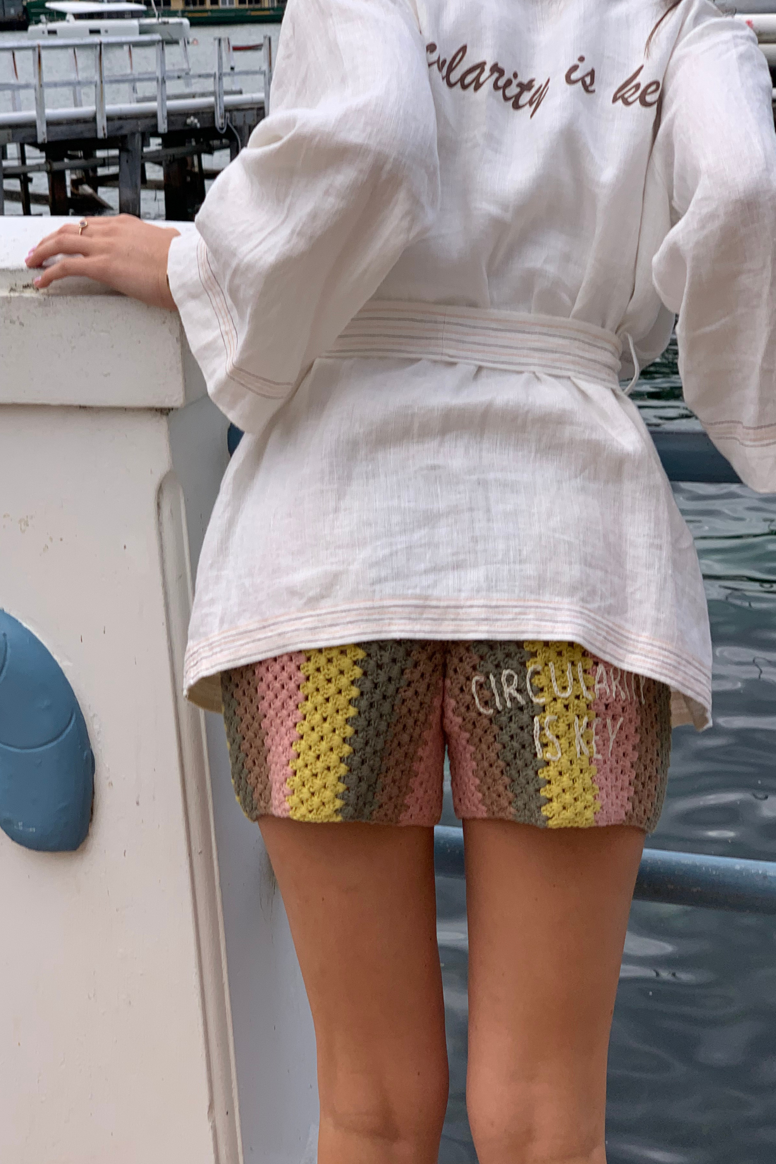 These shorts feature an eco elastic waistband constructed from organic cotton & Natural Tree rubber, finished with organic cotton drawstring. Our signature, finishing touch comes in the form of hand embroidery documenting that circularity is key, embracing a commitment to sustainable practices and a mindful approach to fashion.
